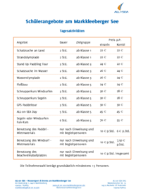 Schülerangebote am Markkleeberger See Tagesaktivitäten Angebot Dauer Zielgruppe Preis p.P. einzeln Kombi Schatzsuche an Land 2 Std. ab Klasse 1 22 € 22 € Strandolympiade 2 Std. ab Klasse 1…